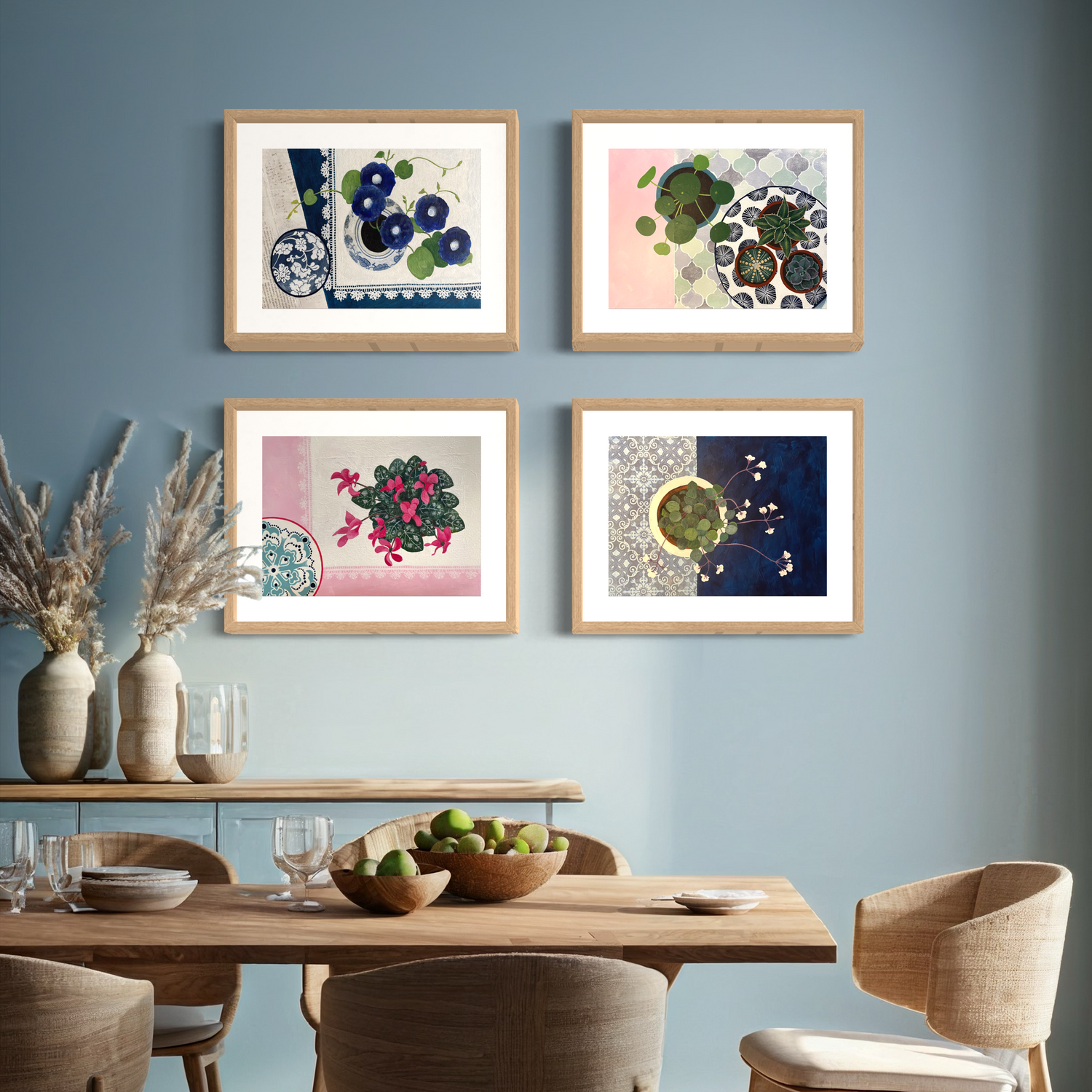 Botanicals are combined with objects collected on my travels. Layers of colour, pattern, and textures create a decorative effect to uplift your space.